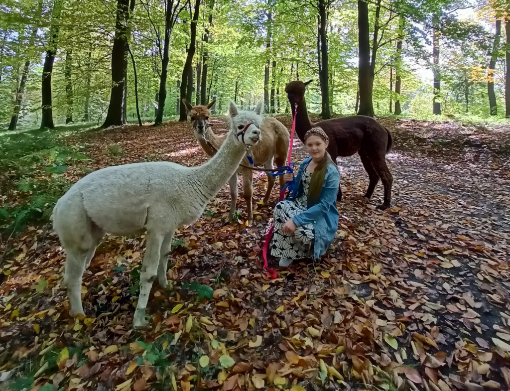 - wyjście z alpaką na spacer w kantarze poza pastwisko