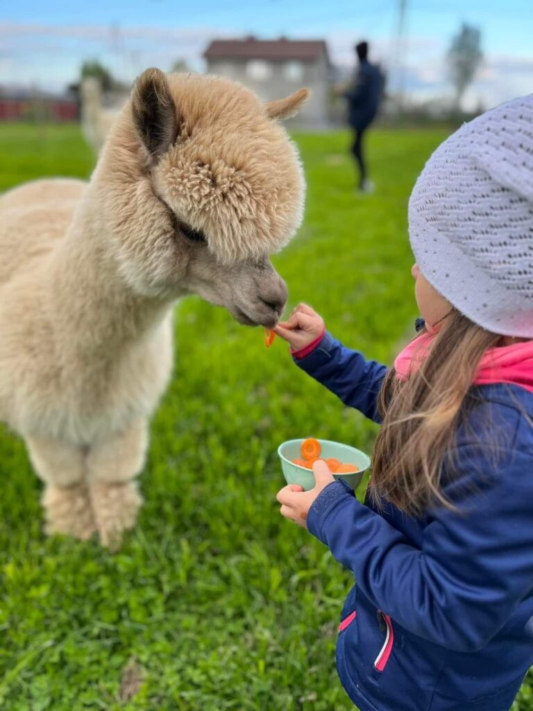 - każdy ma możliwość pójścia z alpaką na mini spacer oraz pogłaskać i nakarmić alpakę