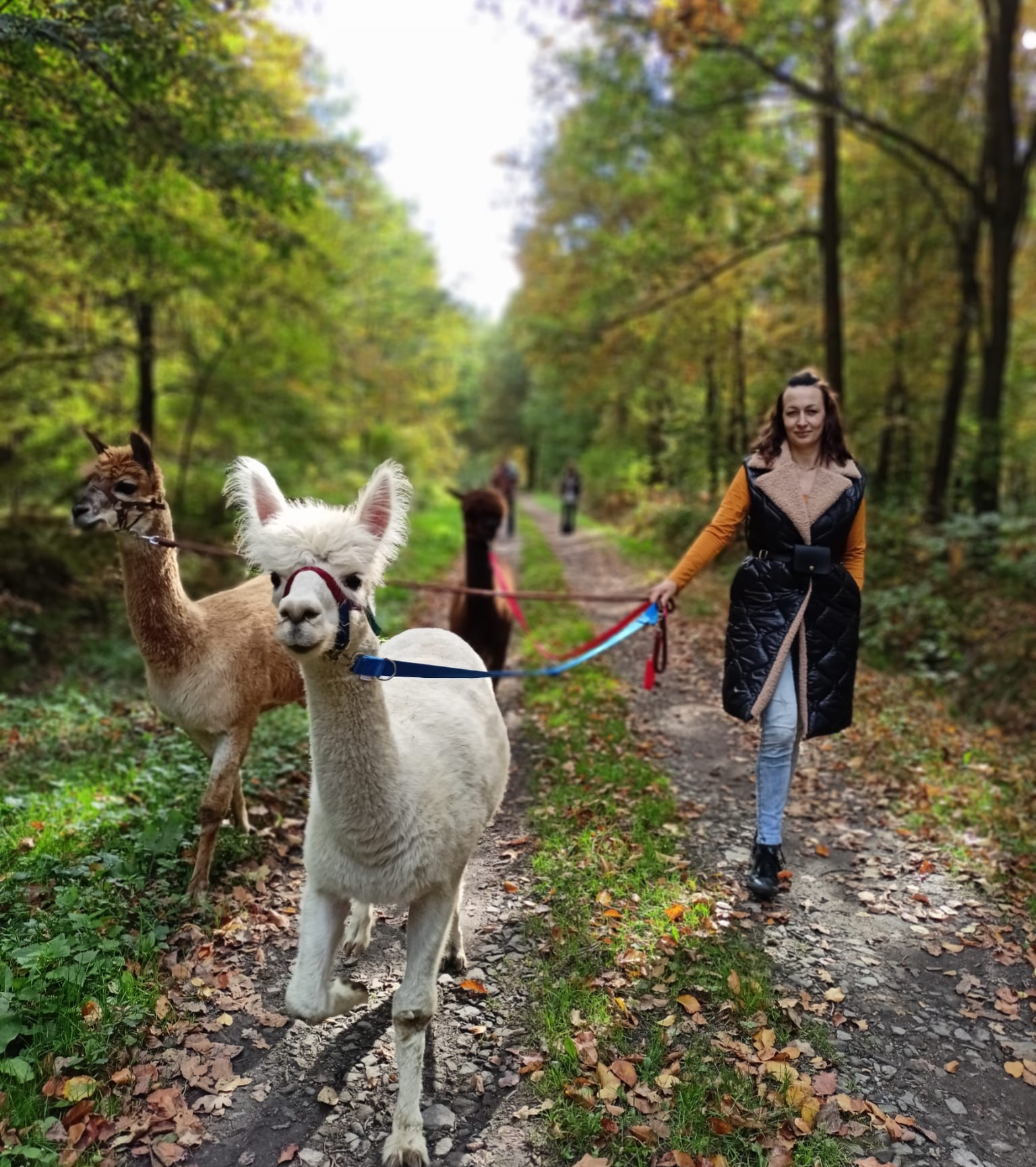 - wyjście z alpaką na spacer w kantarze poza pastwisko